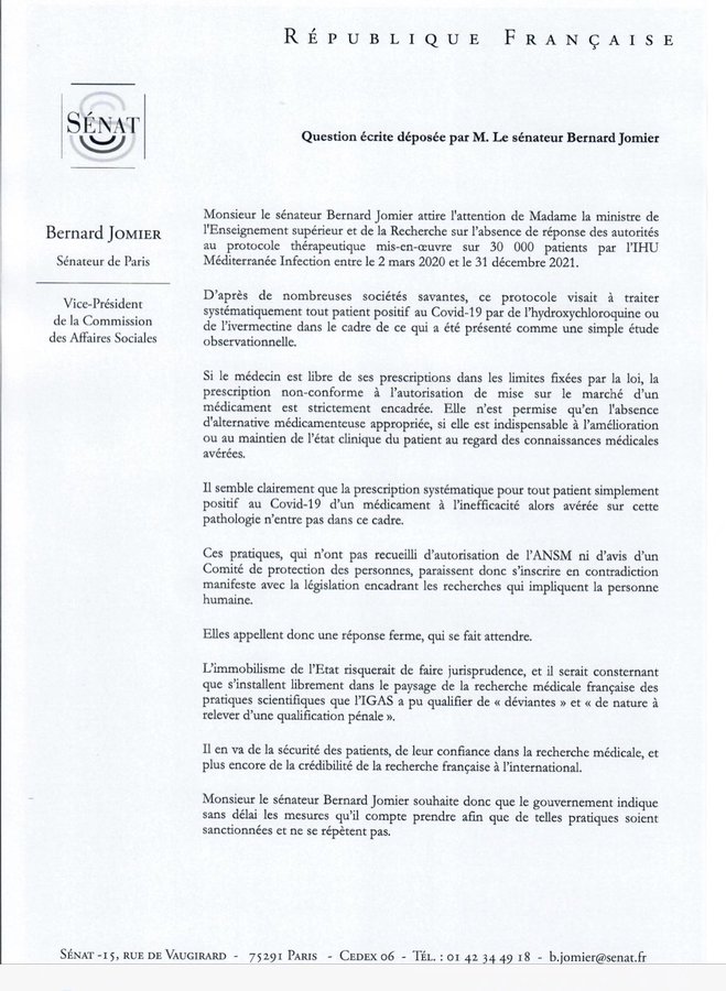 « J’ai déposé ce jour une question écrite à la Ministre de l’enseignement supérieur et de la recherche relative à la recherche manifestement illégale menée sur 30 000 personnes par l’IHU Méditerranée pendant l’épidémie #Covid_19 »