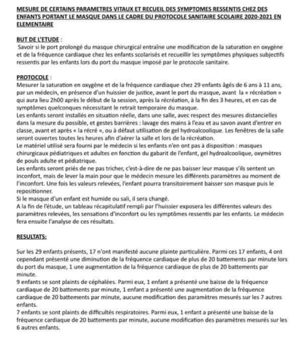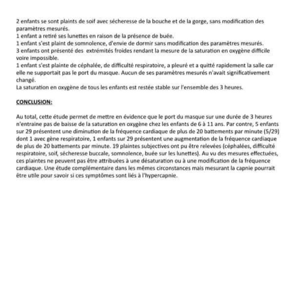 Ce sujet a déjà été traité depuis des mois, d'ailleurs on n'entend plus parler du pataquès sur les masques avec constat d'huissier en présence des guignols Henrion-Caude, Wonner et Brusa je crois ... sur les effets indésirables du port du masque chez les enfants avec mesures de saturation en ox y gène !