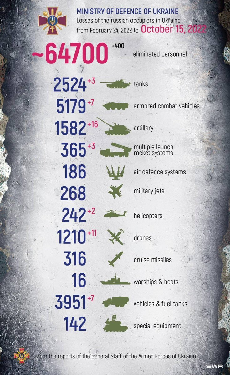 « "It is courage, courage, courage, that raises the blood of life to crimson splendor. Live bravely and present a brave front to adversity." Horace Total combat losses of the enemy from Feb 24 to Oct 10: »