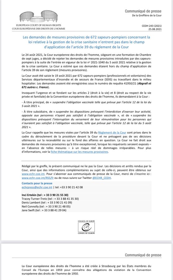 « [News] La Cedh a été saisie en urgence par 672 sapeurs-pompiers pour suspendre l’obligation vaccinale de la loi du 5 août.