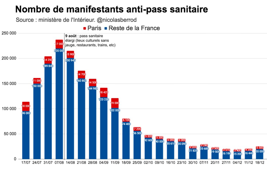 « Léger rebond de la mobilisation anti-pass sanitaire hier : 25 500 personnes ont manifesté en France (selon le ministère de l'Intérieur), contre environ 20 000 chacun des trois samedis précédents. Cela reste beaucoup moins que cet été. #Covid19 »