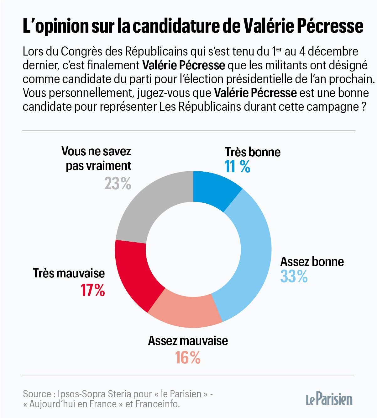 Désignée candidate des Républicains par les adhérents samedi, la présidente de la région Île-de-France obtiendrait 16 % des voix (à plus ou moins 2,6 points avec la marge d’erreur) si le premier tour de l’élection présidentielle devait avoir lieu ce dimanche, d’après notre sondage Ipsos Sopra Steria pour Le Parisien/Aujourd’hui en France et France Info. C’est quatre points de plus que dans notre enquête précédente, il y a deux mois, lorsque Xavier Bertrand était le prétendant du parti de droite le mieux placé. »